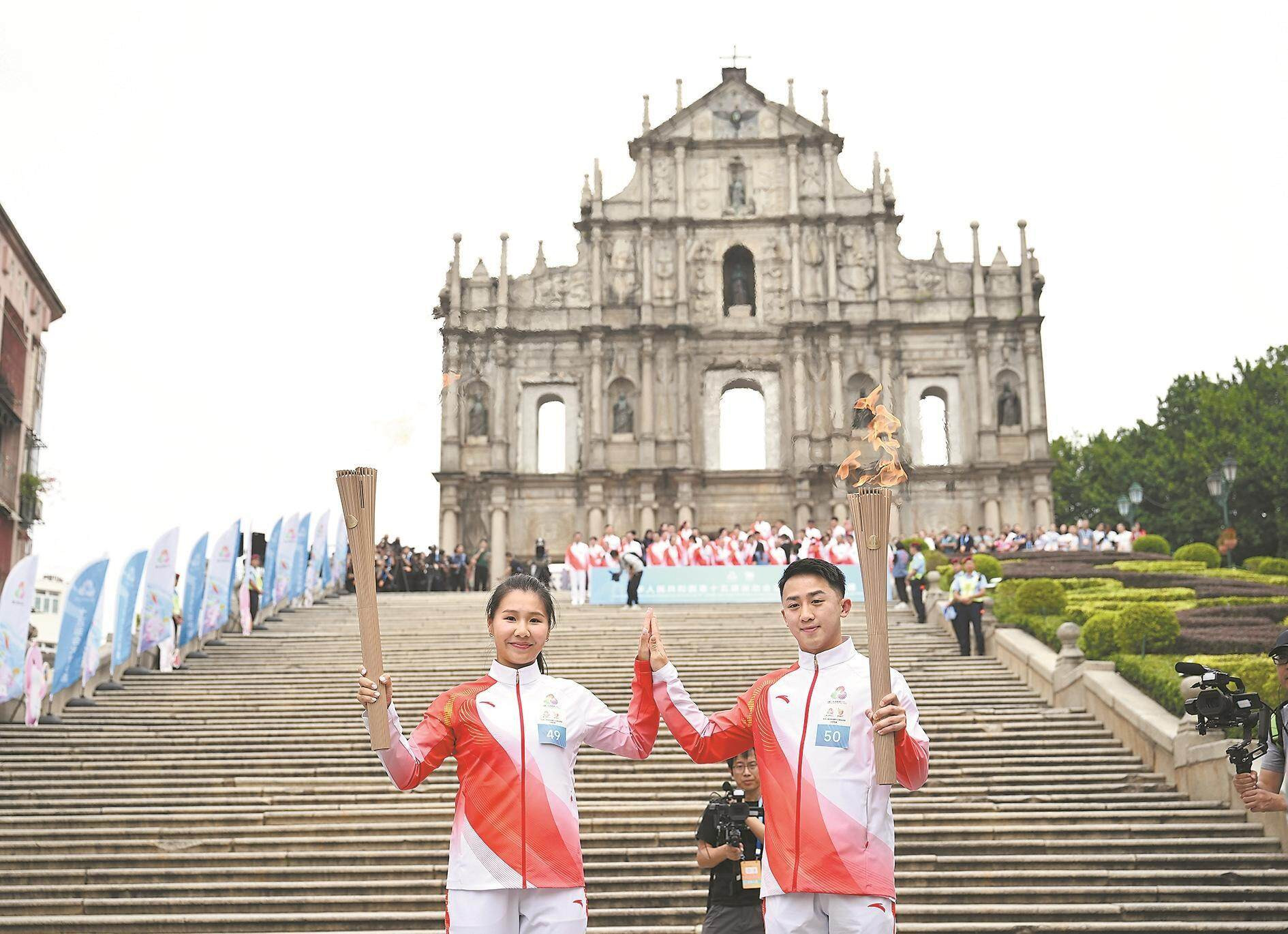 火炬手郭建恒(右)、区海欣在大三巴牌坊前传递火炬