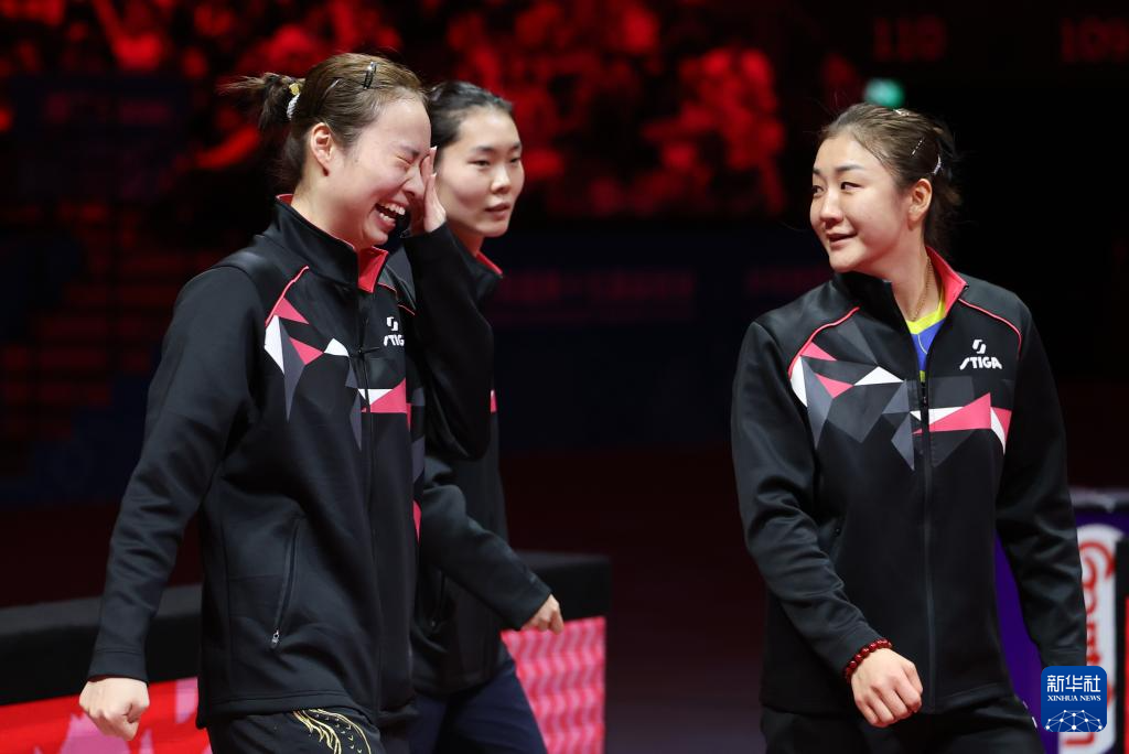 11月19日,山东队选手范思琦(左一)和队友陈梦(左二)庆祝夺冠。范思琦在女单比赛中3比2战胜河北队选手何卓佳。