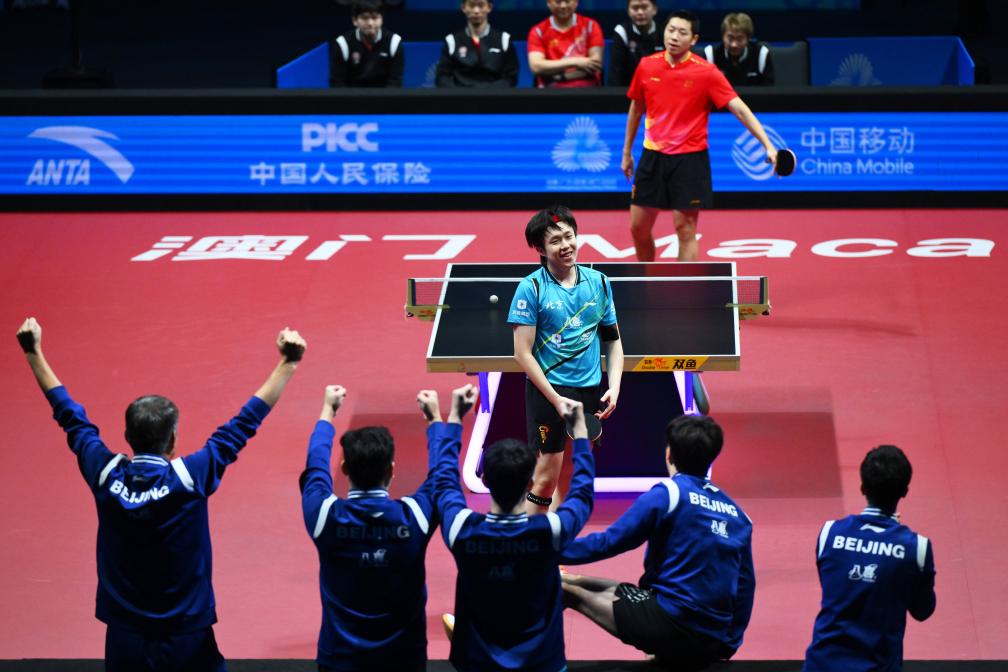 11月20日,北京队选手王楚钦(中)在赢得男单比赛后。新华社发(张金加摄)