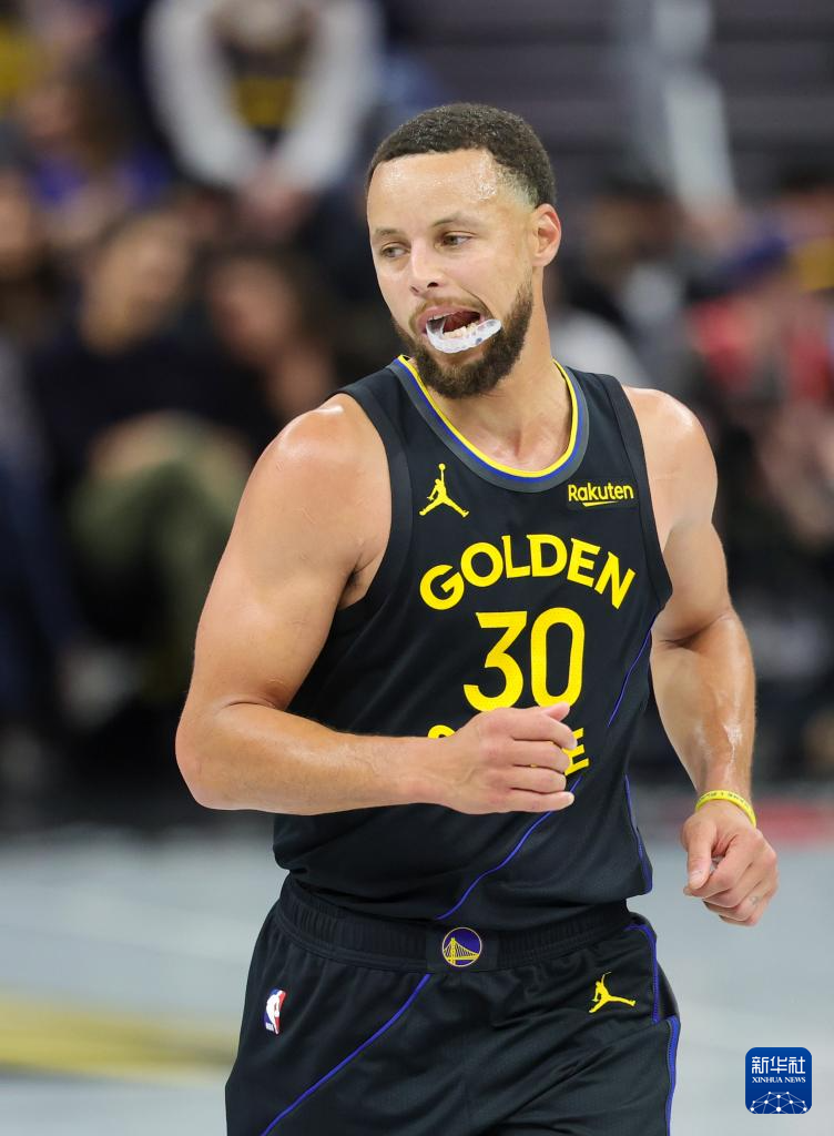 11月26日,勇士队球员库里(左)在比赛中投篮。