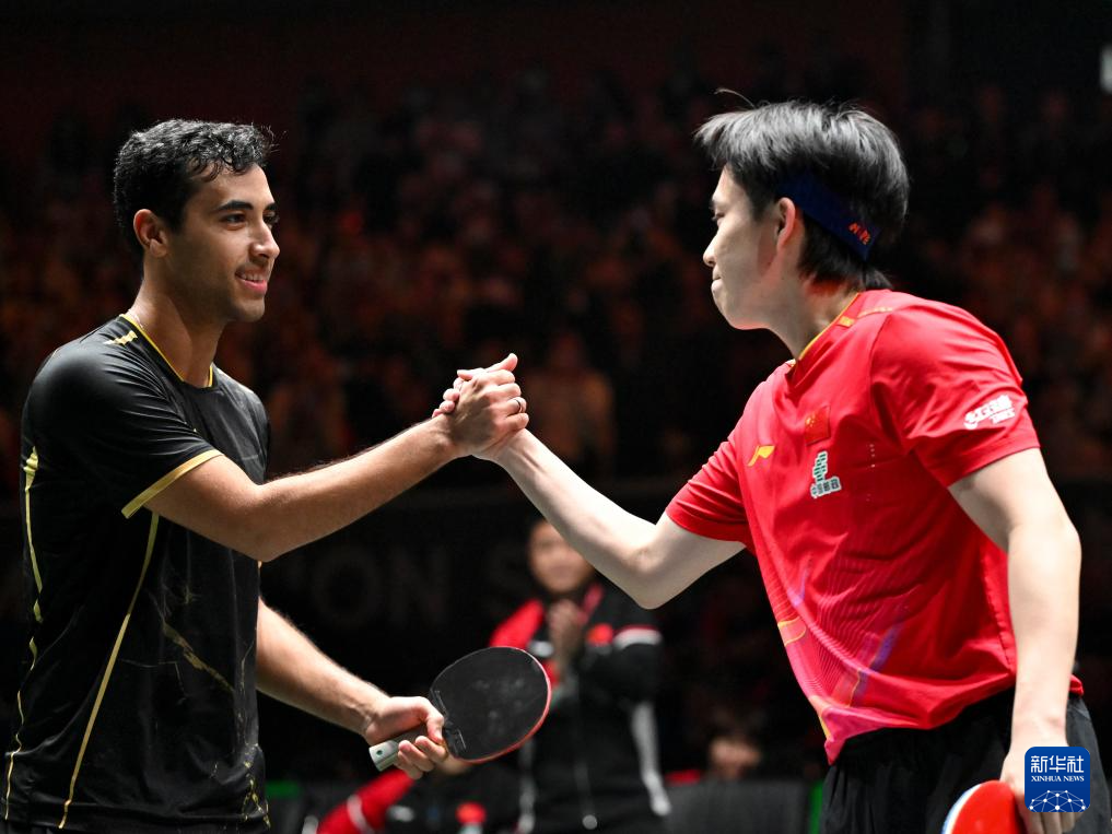 12月1日,埃及队选手约瑟夫·阿卜杜拉齐兹(左)和中国队选手王楚钦在赛后致意。王楚钦2比0战胜约瑟夫·阿卜杜拉齐兹。