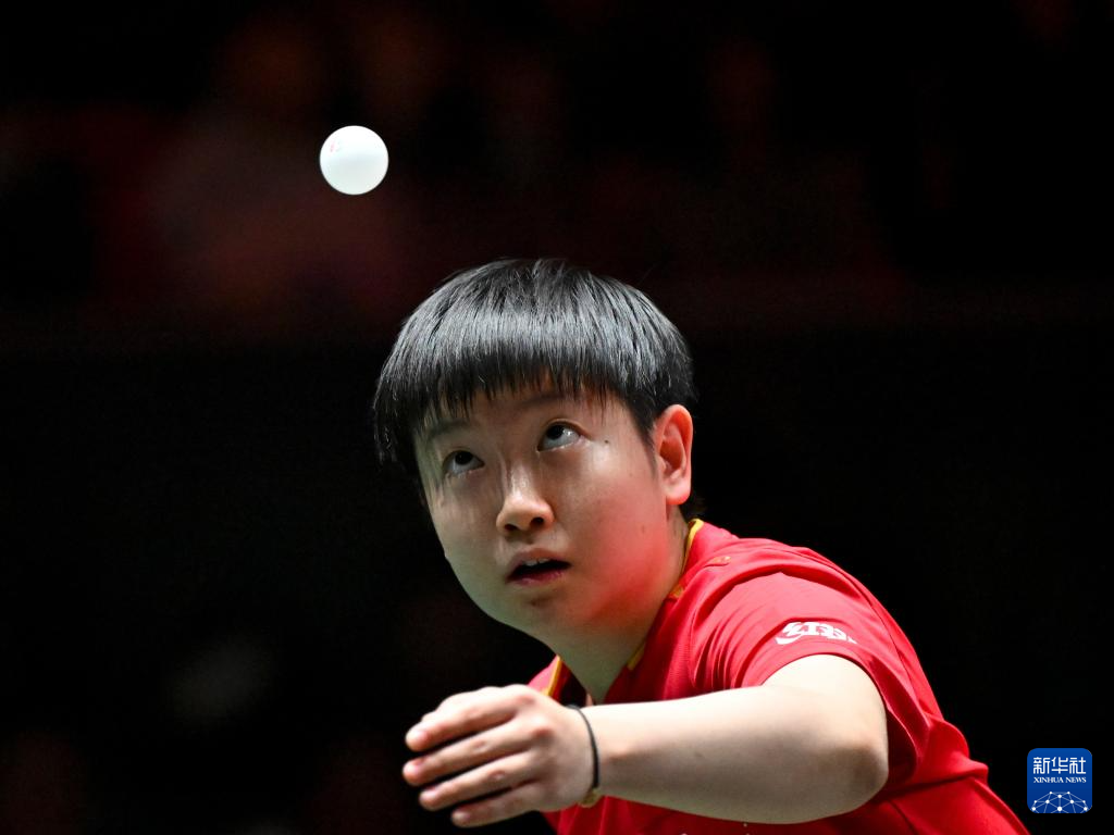 12月1日,中国队选手孙颖莎在女单比赛中发球。她3比0战胜埃及队选手马里亚姆·阿尔霍达比。