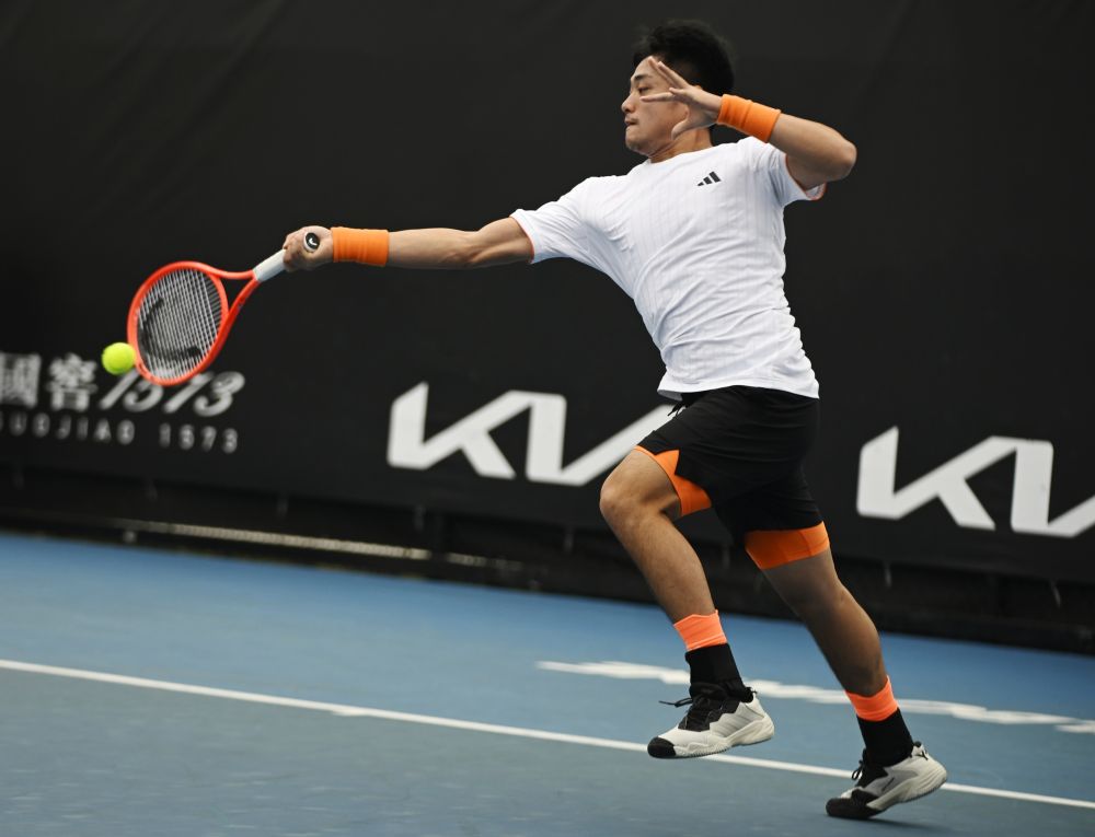 1月13日,吴易昺在比赛中回球。当日,在澳大利亚墨尔本进行的2026年澳大利亚网球公开赛男子单打资格赛首轮比赛中,中国选手吴易昺2:0战胜美国选手克鲁格,晋级资格赛第二轮。新华社发(王申摄)
